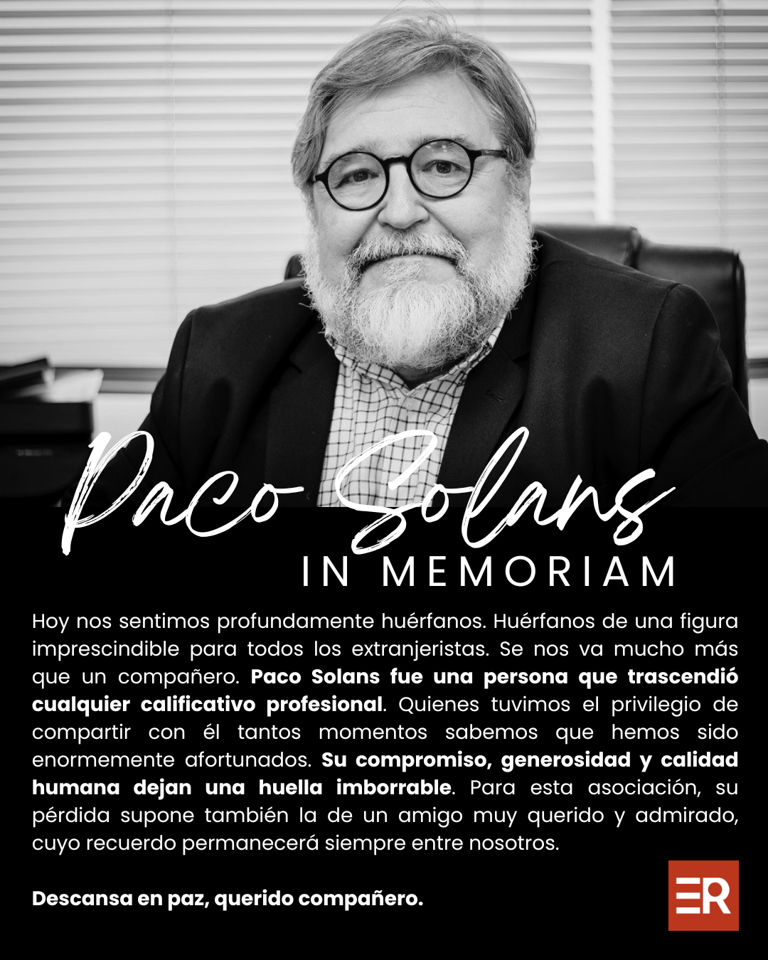 Mi jefe, el mejor jefe que nunca nadie haya podido tener. Un poco jefe, un poco padre y un mucho humano. Paco era uno de esos seres humanos que tienes el privilegio de conocer una sola vez en la vida, uno de los mejores seres humanos que he tenido la gran fortuna de conocer y con el que compartir charlas, horas, confidencias…. Era esa persona a la que podías pasarte la mañana entera escuchando porque todo en el era sabiduría y capacidad de comunicación. Gran maestro, gigante corazón y generosidad sin límites. Paco era esa persona que hacía del mundo un lugar mejor y su marcha nos deja un enorme agujero en el corazón. Siempre serás mi eterno jefe. Gracias por estos años, te quiero mucho Paco Solans. Siempre en nuestro corazón. Ahora más fuerte que nunca NINGUN SER HUMANO ES ILEGAL. ,🤍